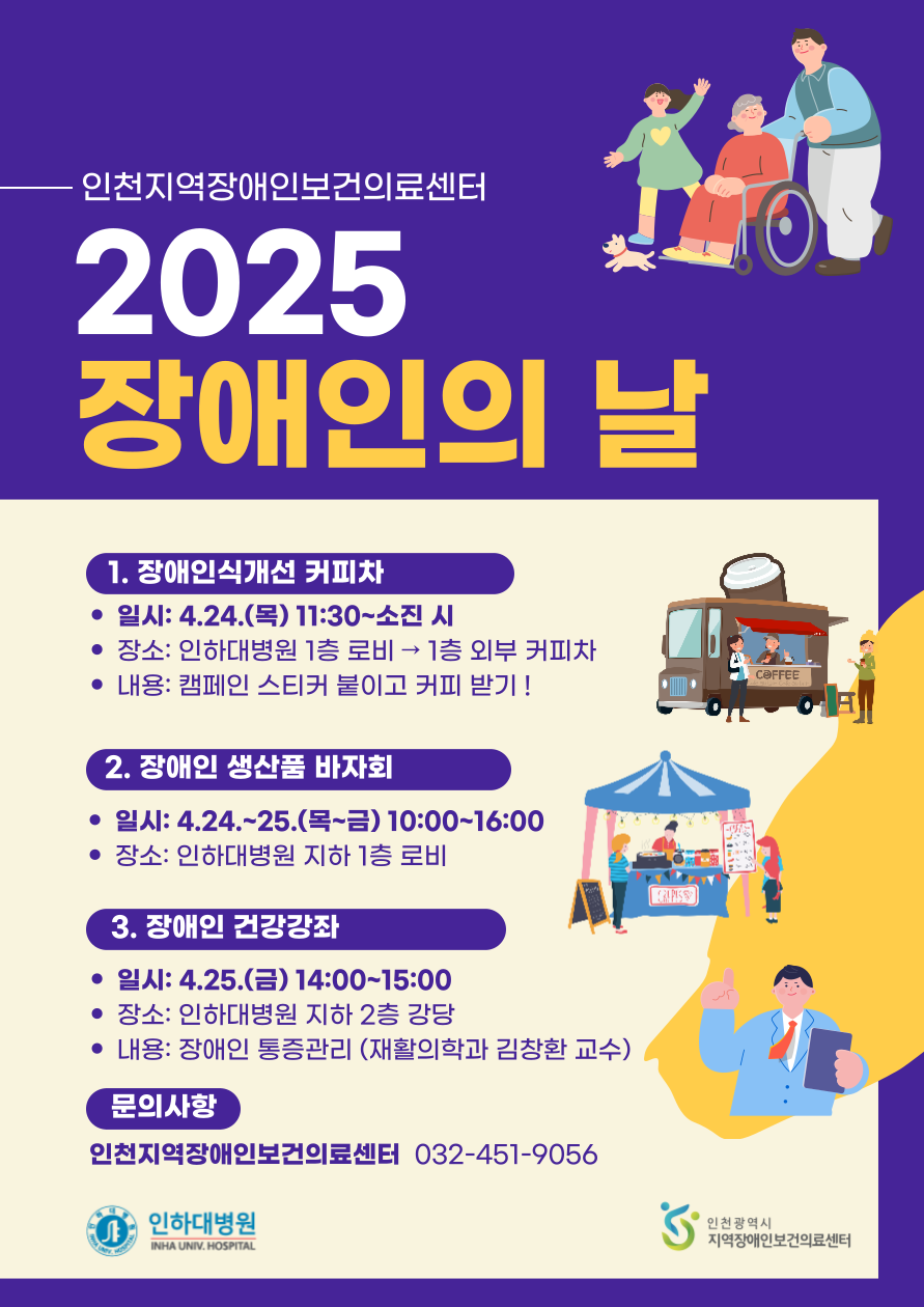 - 일시: 2025년 4월 24일(목)~25일(금) - 장소: 인하대병원 외 - 내용: 장애인식개선 캠페인 커피차, 장애인 생산품 바자회, 장애인 건강강좌 - 문의: 인천지역장애인보건의료센터 이선윤(032-451-9056)